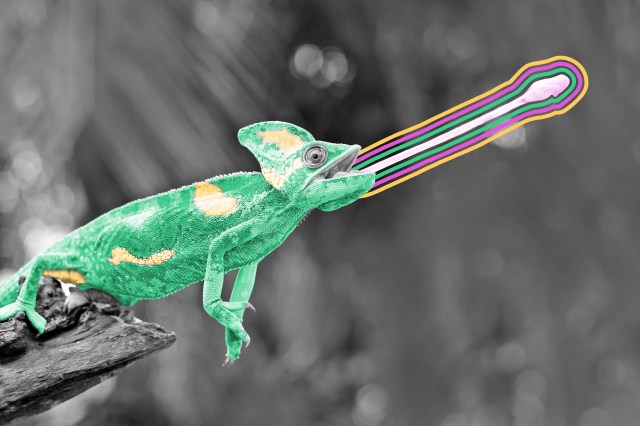 So how do chameleons, which are not particularly large lizards, keep this long tongue in such a small mouth? Well, scientists have discovered that a chameleon’s tongue contains elastic tissue that allows them to effectively store this secret weapon “folded up like an accordion,” in the words of National Geographic. When hunting prey, muscles contract in the mouth, similar to pulling back the string of a bow, and once that tension is released, simple physics takes over. The chameleon’s tongue propels forward with blink-and-you’ll-miss-it speed in a process scientists call “elastic recoil.” Then, a super-sticky, viscous fluid at the tongue’s tip ensnares the whiplashed insect, and the recoil returns the freshly caught meal to the chameleon’s mouth. Yum.