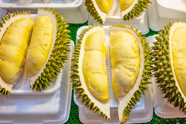 Durian is a large — sometimes soccer ball-sized — fruit with a thorn-covered husk that’s hugely popular in its native Southeast Asia, where it’s sometimes called the “king of fruits.” Fans point to the complex taste of its custard-like pulp, which Desiree Pardo Morales, founder and president of Tropical Fruit Box, described to Martha Stewart as “a mixture of vanilla, diced garlic with notes of pepper, and caramel mixed with whipped cream.”