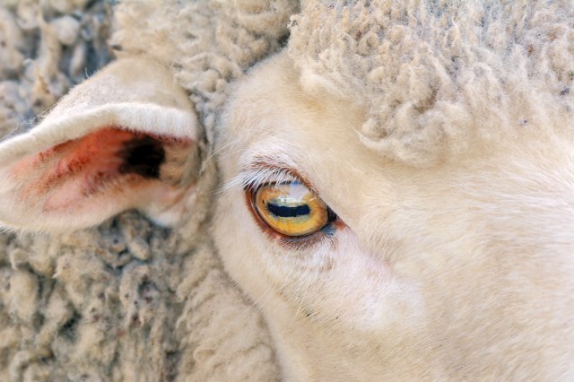Unlike the circular pupils seen in humans and most animals, sheep’s pupils are rectangular (as are goat’s). This odd optical quirk actually functions as a useful defense mechanism: The horizontal pupils increase the animal’s peripheral vision. Most sheep can see 270-320 degrees horizontally — by comparison, humans with normal vision can only see about 160-180 degrees horizontally without moving their head. In practice, this greater field of vision allows sheep to easily spot potential predators while they have their heads down grazing in a field.